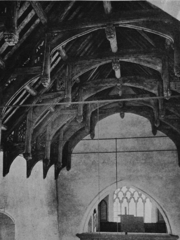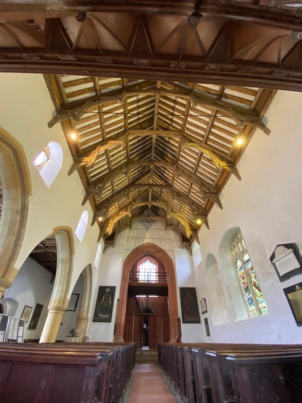 The Nave roof (late 15th/early 16th Century) is of the double hammer-beam type and one of the finest examples in Essex. Carved in the timber work on the North side are the names 'Peter Barnard and Marget has Wyf' and on the South side the names 'Thomas Loved and Alys has Wyf'. Earlier regarded as benefactors, it is now believed that Loved was the actual builder.