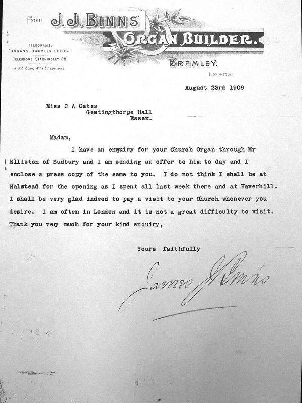 Built by Binns of Leeds, it was dedicated in 1910 and the opening recital was given by Sir Frederick Bridge, organist of Westminster Abbey and singer Frederick Ranalow.
